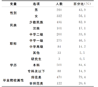 本研究选取西南地区某民族自治县作为调查区域。该县位于云南省西北部,是滇、川、藏经济文化交汇带,也是东巴文化的发祥地。全县总人口22.25万人,其中少数民族人口19.13万人,占总人口的86%。本研究向该县所有初级中学(共计13所)的教师发放纸质问卷,共发放问卷607份,回收有效问卷592份(有效回收率为97.52%)。表1展示了样本教师的基本信息。