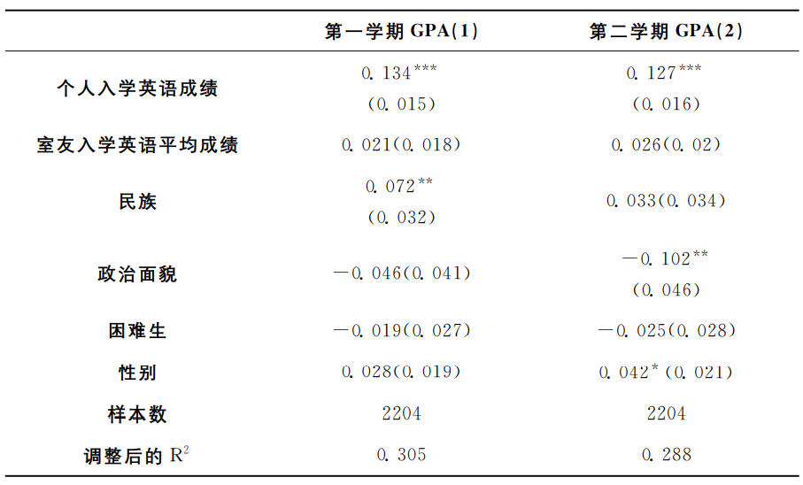 本研究的控制变量包括学生个人特征和家庭背景。学生个人特征包括:性别、民族、政治面貌、生源地、个人入学英语测试成绩、专业、宿舍规模和宿舍楼栋号;其中生源地、专业、宿舍楼栋号是以固定效应的形式加入回归模型。