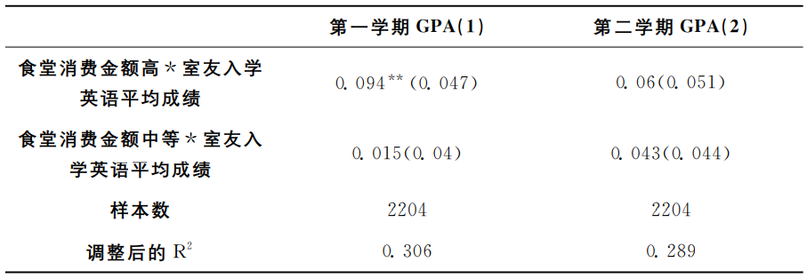 ②如果不依据食堂消费金额对学生进行分类,用食堂消费金额与室友入学英语成绩进行交互,大一第一学期的交互系数正显著(交互系数为0.012,标准误为0.004),大一第二学期的交互系数不显著,回归结果性质与表6一致。