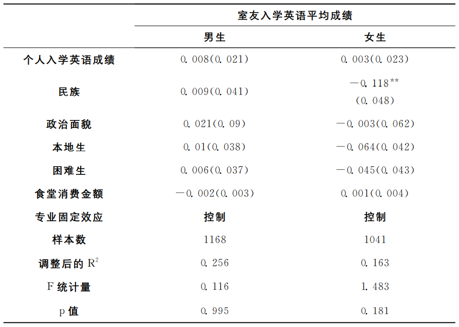 第二项测试,检验室友学习能力与个人特征之间的相关性。在控制了专业固定效应之后,以室友入学英语平均成绩为因变量对民族、政治面貌、本地生等个人特征分性别进行联合显著性F检验。表3显示,p值大于0.1,F统计量小,表明室友入学英语平均成绩与个人特征联合不显著,进一步证明宿舍分配是随机的。