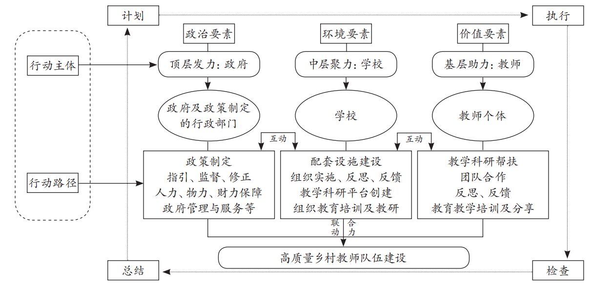整体逻辑运行通过多元主体合作行动路径完成。其中,行动主体包括政府、学校和教师。行动路径指向“计划、执行、检查、总结”的循环反复的过程。政府作为行动主体,是政策的顶层设计者、制定者和颁布者,在政策制定的过程中应从目标定位、价值理念、执行保障、监督反馈等方面为乡村教师队伍建设做好部署工作。在目标定位上,应从“建设什么样的乡村教师队伍、如何建设乡村教师队伍”出发,以落实师德高尚、素质优良、数量充足为根本任务;在价值理念上,以有情怀、有担当、肯奉献的教师为榜样,注重发挥乡村教师新乡贤示范引领作用;在执行保障上,要加大统筹力度,建立教育、财政、人力资源社会保障等部门协同机制,形成工作合力;在监督反馈上,要求各地把乡村教师队伍建设纳入对地方政府履行教育职责评价内容,对落实不到位的严肃问责。同时注重基层单位对现实情况的反馈,了解基层教师队伍的实际需求,在政策设计源头做好引领,为乡村教师队伍高质量建设提供政策保障。