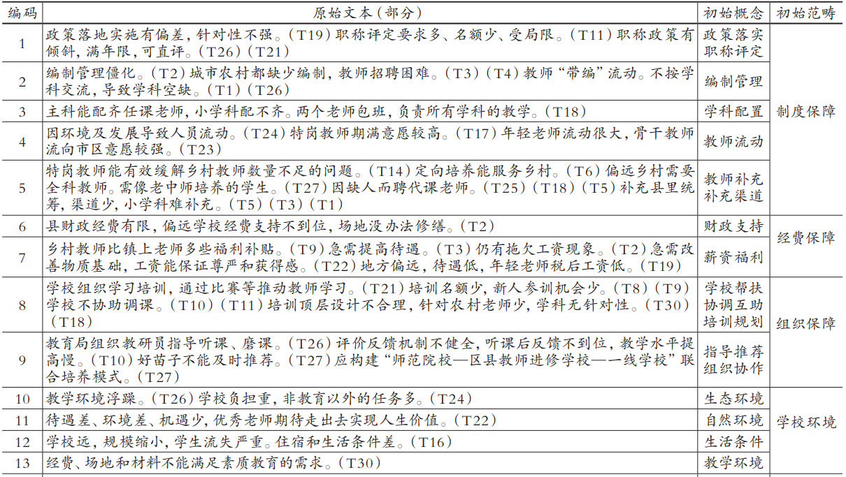 为保证访谈材料的层次性、完整性和代表性,本研究在调查对象的选择上考虑了地域分布和人员身份,主要是广西等地的32位乡村义务教育阶段学校的一线教师、中层管理人员、校长及教育局管理人员,并涉及少量城区和城乡接合部义务教育学校教师,以期明确城乡之间的教师资源配置的异同。访谈围绕“为服务乡村振兴,高质量建设乡村教师队伍,在政策层面、学校层面、教师待遇、教师个人等方面存在哪些问题,应如何改进”等内容进行,获取了6万多字的原始访谈资料,对收集的32份原始资料进行由下而上的逐级浓缩、聚合,探寻影响乡村教师队伍建设的原因[4]。基于扎根理论的方法指导,依托“三级编码”,即开放式编码、主轴编码、选择性编码,将观察到的现象概念化,把概念整合为范畴继而生成主范畴以及核心范畴,并通过概念间的逻辑关系与适切的联结点,将核心范畴、主范畴与初始范畴联接,形成乡村教师队伍建设高质量发展逻辑模型[5]。第一步,通过开放式编码将资料进行整理分析、类别归类与初始范畴生成;第二步,通过主轴编码将可能影响乡村教师队伍高质量建设的概念建立联接,生成主范畴;第三步,通过选择性编码对政策、环境及价值等主要类属进行整合,并解释影响乡村教师队伍建设的各要素之间的关系。