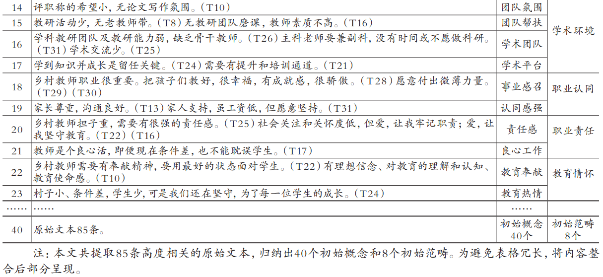 开放式编码是扎根研究的第一步,是研究者悬置所有主观意向,将收集到的分散的原始信息按其原始状态进行分类编码,然后重新归类,从原始资料中产生初始概念的过程。第一步,对26份原始资料进行多次分类、比较、筛选和标记,给原始资料贴标签,归纳关键信息,使之范畴化;其余6份原始资料用于饱和度验证。第二步,剔除重复频率低的信息或概念,整合重复频率高的信息或概念,提取出约85条关键信息。第三步,再次比较和整合,从26份原始资料中归纳得出40个初始概念,形成8个初始范畴,包括制度保障、经费保障、组织保障、学校环境、学术环境、职业认同、职业责任、教育情怀。详见表1。
