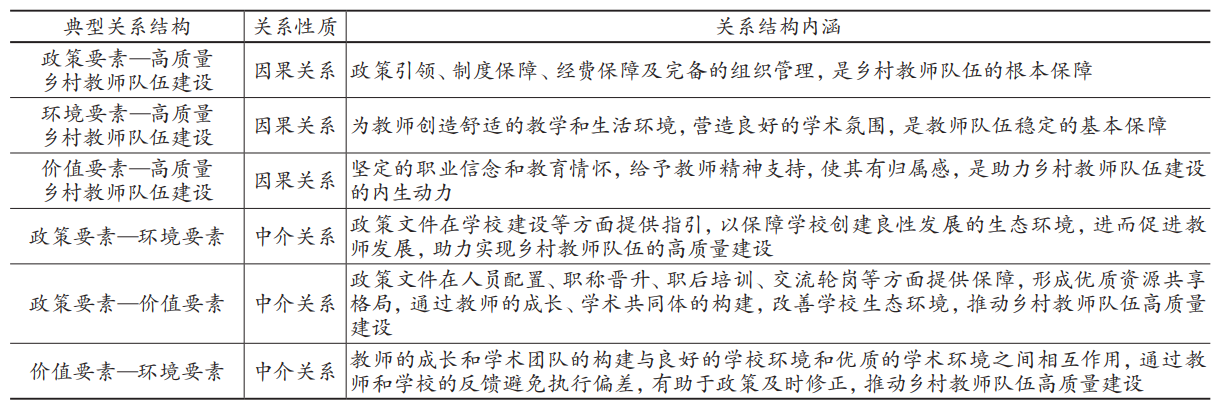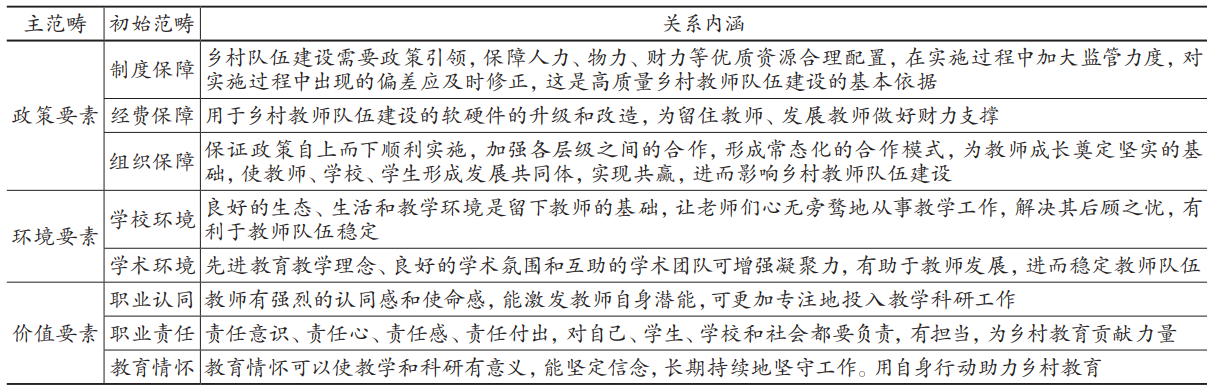 选择性编码是在开放式编码和主轴编码的基础上,进一步处理主范畴之间的关系,分析其中的关键节点,建立核心概念与乡村教师队伍高质量建设之间的内在逻辑联系。通过再次整理发现,乡村教师队伍建设需要通过制度、经费和组织等保障要素作引领,政策的顶层设计、经费的财力保障、组织的协调沟通关乎乡村教师队伍的建设和建好,可以有效地解决教师“下得去”的问题;学校环境和学术环境是保障乡村教师队伍建设的中层环境要素,构建学校、教师和学生三者的发展共同体,有利于乡村教师队伍的稳定,保证教师“留得住”;教师的职业认同、职业责任和教育情怀是教师个人发展的基础要素,良好的学术氛围、科研团队和职业发展平台能促进教师自身成长,以保证教师“教得好”。主范畴的典型关系结构详见表3。