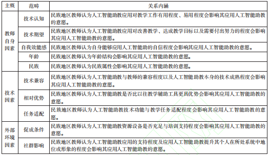 所有访谈记录编码完成后,另外选择2个访谈样本进行饱和度检验,再次对访谈内容进行编码。结果表明:已有概念范畴相对完备,除影响民族地区教师人工智能助教使用意愿的3个主范畴(教师自身因素、技术因素、外部环境因素)之外,未发现新概念与新范畴。因此,可以认为通过扎根理论得出的“民族地区教师人工智能助教应用意愿影响因素”在理论上已经达到饱和。