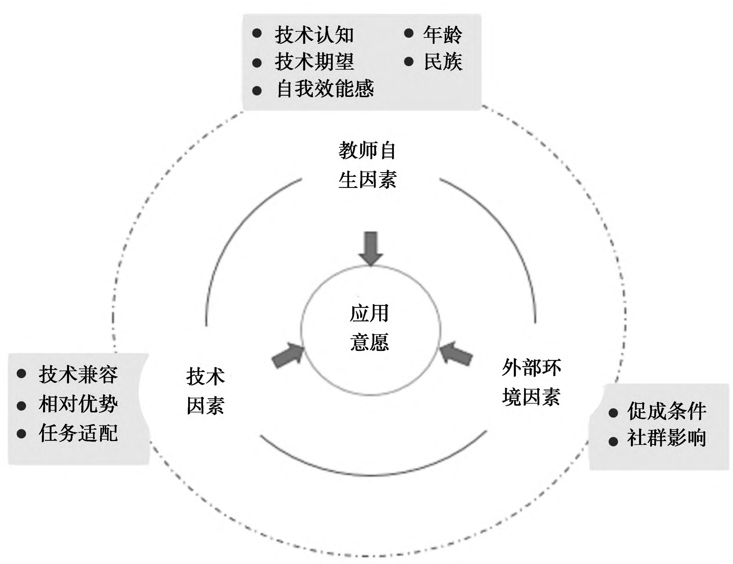 本研究通过扎根理论的三级编码过程,在开放式编码阶段提炼了16个初始概念,形成主轴编码的10个范畴(技术认知、技术期望、自我效能感、年龄、民族、技术特性、相对优势、任务适配、促成条件、社群影响)与选择性编码所得的三类主要因素(教师自身因素、技术因素、外部环境因素)以及范畴与概念之间的关系为依据,构建了民族地区教师人工智能助教应用意愿影响因素模型(见图1)。