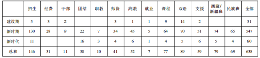 需要说明的是,笔者在将文件归类时,如果某个文件最接近某一领域,就归入相应的领域。如《教育部办公厅关于切实做好高校少数民族预科学生自主培养工作的通知》就归入民族预科班、民族班领域,而未归入高等教育领域。如果某个文件与某两个领域都较为接近,便同时归入相应的领域。如《关于编制2001年普通高等学校招收内地西藏班学生计划的通知》就归于“招生录取”“内地西藏、新疆高中班”两类。除此之外,还有一类文件属于对民族教育基本方针的阐述,如《国家教委民族地区教育司关于印发〈全国民族教育发展与改革指导纲要(试行)〉的通知》,就未划入十三个具体领域之中。后果即是,这十三个领域在特定历史阶段的数量总和与特定历史阶段全部文件的实际数量并不一致。