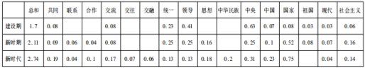 ③为了制表方便,笔者在表2中将“边远”“优惠”的加权百分比分别归入“边疆”“优先”。表3中,“沟通”“现代化”的加权百分比分别归入“合作”“现代”,“党中央”“中共中央”的加权百分比归入“中央”。