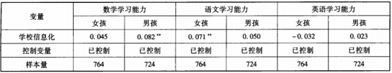 第一,学校信息化对少数民族儿童在数学和语文两个科目的学习能力具有提升作用,但不具有增强英语学习能力的效应。这表明教育信息化对少数民族教育质量的影响具有学科差异性。