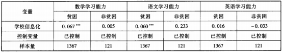 第三,学校信息化对学习能力的促进作用在少数民族儿童中的弱势群体(女性儿童和贫困儿童)表现得更加明显。这表明教育信息化可以在少数民族内部缓解基于性别和阶层的教育不平等,也即产生了促进教育公平的效应。