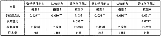 第二,认知能力是学校信息化提升少数民族教育质量的重要机制。具体而言,在学校接受信息化教育可以强化少数民族儿童的认知能力,进而加强其在数学和语文两科的学习能力。