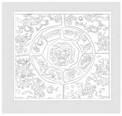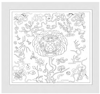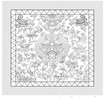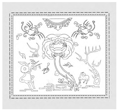 仫佬族图案正上方的半边太阳、太阳左右旁边两只凤凰(锦鸡)、中心混沌花、四周围绕自然生物的结构形式历经百年不变,依旧保持了当年的结构,组成元素基本相同。总体来说,图案组织疏密有致,以混沌花表达的人间为主体,围绕自然万物,主次分明。这样的结构形式饱含了仫佬族先祖设计理念,体现他们一直遵循的天、地、人和谐统一的核心精神,已经形成程式化传承下来,也是仫佬族图案的精髓所在(见图11-15)。
