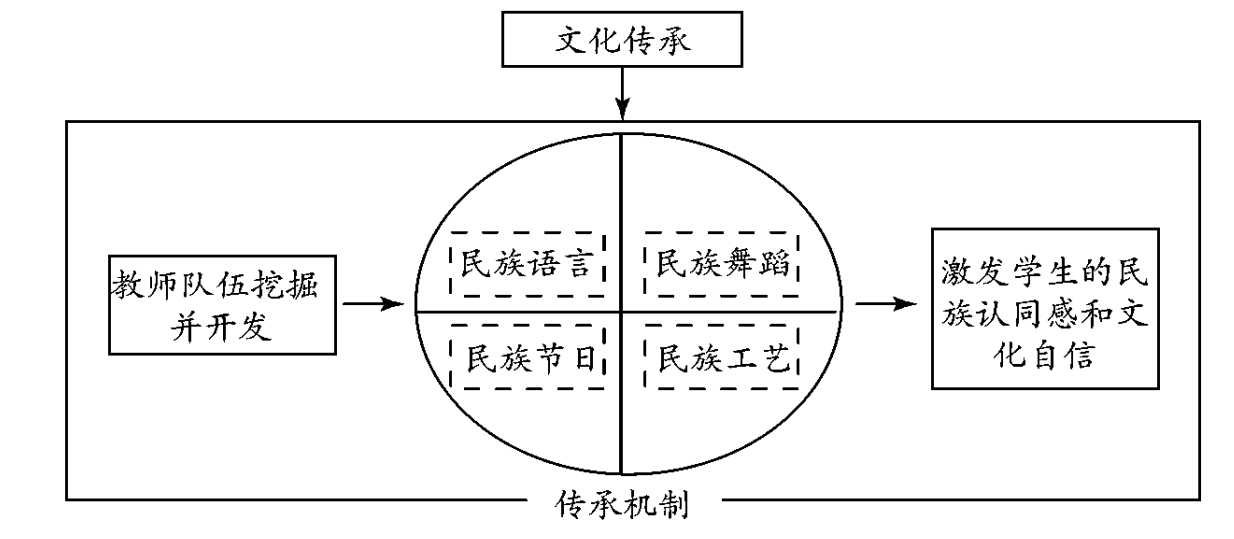 上文从民族认同与国家认同的角度探讨了文化在两者相互交流过程中的作用。强文化模式指民族地区基础教育通过民族文化在教育领域的渗透或学科交叉融合的方式,提升学生对本民族文化的认同感,实现对优秀民族文化的传承与创新,形成强烈的民族文化自信,从而铸牢中华民族文化共同体意识,推动民族地区基础教育高质量发展(如图1)。从发展定位来看,遵循该模式的民族地区的学校机构要突出“文化性”的办学定位,将文化传承作为育人的重要使命。该模式的最大特点是民族地区基础教育学校通过借助本土优秀民族文化优势,积极开展丰富多彩的文化活动,并展现出强劲的文化渗透力。