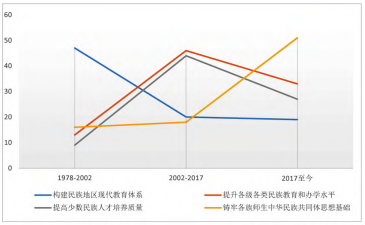 本文整理了我国民族教育政策的关注焦点在1978—2002年、2002—2017年以及2017年至今的变化趋势如下图(图5)。