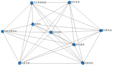 通过对民族教育政策关注焦点的梳理发现,我国民族教育政策的变迁史实际上也从侧面反映了我国民族地区教育生态逐渐完善的过程,其过程呈现出从宏观到中观再到微观,由表及里、逐层递进的特点。为此,本文运用Ucinet软件,提取上述三个阶段中所发布的民族教育政策中的关键词,绘制共现图,并结合“政策关注焦点—教育生态系统”的二维分析框架进一步探究我国民族教育政策关注焦点及教育生态系统在不同时间序列中逐渐完善的演进逻辑。