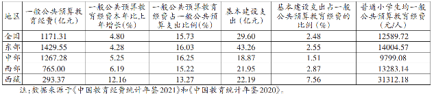 根据《中国教育统计年鉴2020》,对西藏地区与东、中、西部地区教育财力资源配置数据进行均值处理,结果如下:
