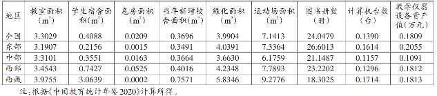 表2 2020年西藏与东、中、西部地区物力资源配置对比(小学)