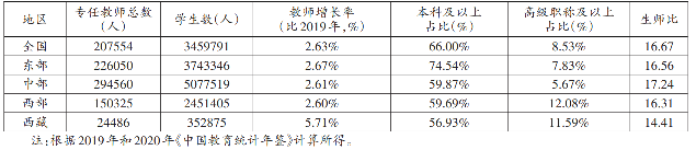从表3能够得知,在西藏地区教师资源配置中,仅教师本科学历及以上占比落后于全国平均水平,其他均显著高于全国平均水平。相比东、中、西部地区教师增长率而言,西藏地区教师增长率达到了5.71%,表明近年来,西藏地区教师队伍不断扩充,在一定程度上缓解了教师队伍结构性短缺问题,但在教师引进时还要加强对教师学历的把关,吸引更多优质教师,实现从量到质的转变。同时,西藏地区教师高级职称及以上占比也明显高于东、中部地区以及全国平均水平。一方面是因为国家对于西部地区教育给予了一定的照顾,适当放宽了教师评定标准和条件,增加高级职称名额,从而导致其教师高级职称占比较高。另一方面也说明近几年西藏地区在引进优秀人才方面做出了巨大努力,但西藏应注意在人才“引进来”之后更需“用得好”,充分发挥优质教师效益,推进教师队伍建设“量”“质”双效提升。另外,西藏地区小学生师比明显低于东、中、西部地区和全国平均水平。从1992-2006年,15年间生师比均高于20的水平[9],到2020年仅为14.41,低于全国平均水平。可以看出,西藏地区在师资力量充实上成绩斐然,这得益于“三支一扶”“定向就业”等特殊的西部人才援引政策。但边境的国门学校仍然存在着师资匮乏、“一师多职”的现象。例如,阿里地区共8个行政区域,其中有4个边境县,而边境县的教师仅占全区教师的33.81%。截至2020年10月,边境县札达县的小学甚至没有专门教授艺术、音乐、美术的教师;边境地区师资匮乏的同时教师流失现象还较为严重,边境县日土县2020年基础教育共增教师8名,却减少了19名教师[8]。这种状况一方面可能由边境地区高寒缺氧的环境,教师身体压力较大引起;另一方面,可能由边境地区经济、教育发展水平不高,教师幸福感不强导致。由此观之,西藏亟需建设一支能够适应本土化环境的教师队伍,全面加强教师队伍建设举措,推进高质量教师队伍建设;同时,还需注重调节区内教师供给平衡,确保由一般均衡向特殊供求平衡过渡。