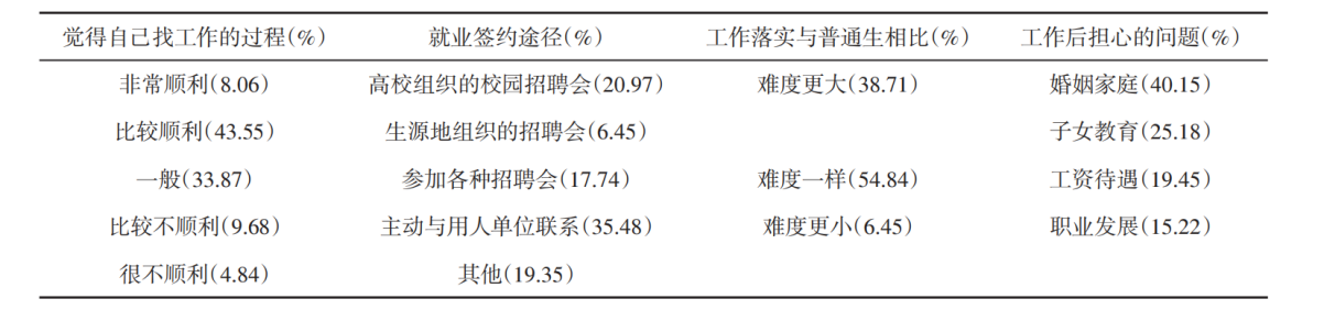 4.婚姻工作方面。该部分主要是对有工作经验的少数民族研究生进行调查。根据表2的数据,有93.55%的少数民族研究生认为自己找工作的情况与正常统招生相比同样难或者更难。在找工作的过程中,少数民族研究生采取了积极的策略,包括参加高校组织的校园招聘会、生源地组织的招聘会、其他招聘会以及主动与用人单位联系等方式。其中,有35.48%的毕业生是通过自己主动与用人单位联系而找到工作的。相对来说,通过生源地组织的招聘会所获得工作的毕业生比例最低,仅有6.45%。调查还发现,“婚姻家庭”是少数民族研究生工作后最担心的问题,其比例达到40.15%。在高校中,少数民族研究生作为特色群体,有“同病相怜”的情怀,在几年的朝夕相处中,部分学生之间会产生恋爱关系。然而,《骨干计划》规定研究生毕业后,在职人员需要回到定向单位工作,非在职人员需要按定向协议回到定向地区就业。硕士服务期为5年,博士服务期为8年。这也成为困扰少数民族研究生工作的一大顾虑。如一对少数民族骨干高层次恋人因为工作协议的限制而不得不分开就业的故事。他们在本科时在内蒙古的一所二本高校相识,之后一起考上了陕西师范大学,但由于协议规定,Y3同学必须回到内蒙古就业,而他的女友也必须回到自己的原籍就业。尽管他们恋爱七年,但最终还是选择了分开。此外,文章还提到了一些研究生毕业后的担忧,包括子女教育等问题,该问题的比例约为25.18%。
