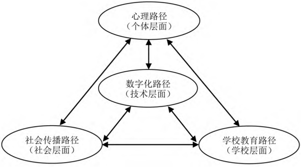 民族地区推广普及国家通用语言文字是一项复杂性、系统性的社会活动,涉及到语言学习态度、学校语言教学、社区语言传播、语言环境建设等问题。如何培育积极的国家通用语言文字学习态度与情感?如何夯实学校推广普及国家通用语言文字的主阵地作用?如何拓宽国家通用语言文字的社会传播途径?数字化如何赋能国家通用语言文字推广普及?亟须从跨学科整合的视角,探究个体、家庭、学校、社区等多个社会主体的联动推进策略。当前,国内关于国家通用语言文字推广普及研究的学科视角较为单一,大多侧重于国家通用语言政策解读与意义的讨论,缺乏系统性、整合性的策略研究。本研究试图将心理学、教育学、社会传播学与教育技术等学科联结起来,从跨学科整合的视角,分别提出民族地区推广普及国家通用语言文字的心理路径、学校教育路径、社会传播路径与教育数字化路径,以期为提升国家通用语言文字推广普及工作质量提供理论依据。本研究分析的思路与逻辑如下图所示。