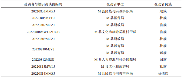 本研究以我国华南某自治区青年民族干部(以下简称青年民族干部)为研究对象,采用常人方法学的方法进行微观层面的考察。作为科层组织的标准化“产物”,青年民族干部群体具有多元一体的特征,允许在技术规划上采取“以小见大”“观局部知全貌”的方案。本研究采取了“滚雪球”这一非概率抽样的方法,选取10名少数民族地区干部作为研究对象。表1是10名访谈对象的基本情况,其中M县民族与宗教事务局的干部是本研究调研对象选取的起点。在确定访谈对象后设计访谈提纲,其主要内容是青年民族干部的成长经历及其在地区民族工作中的作用和影响。在此基础上,结合近年特定地区民族工作的具体政策,将访谈对象自身的经历与国家、民族地区发展结合起来。