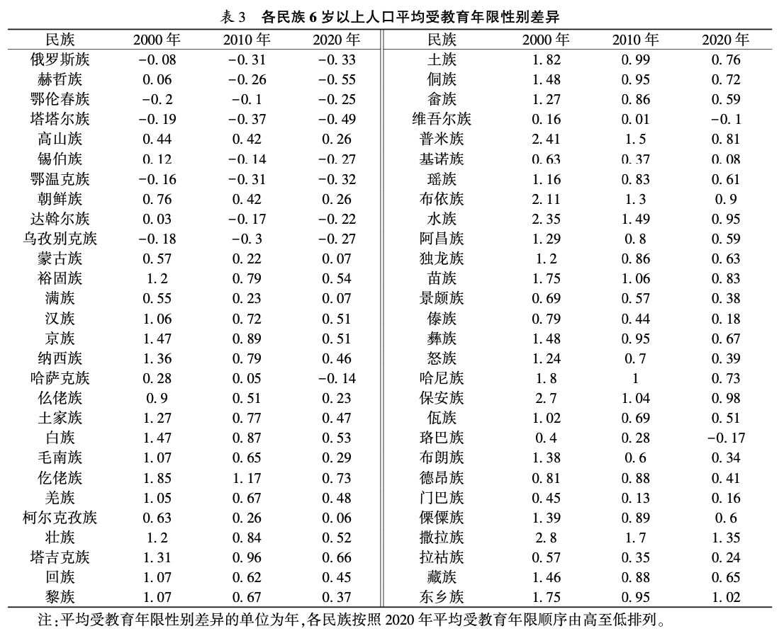 2000年平均受教育年限性别差异最大的民族为撒拉族(2.8年)、保安族(2.7年)、普米族(2.41年)。2020年平均受教育年限性别差异最大的民族为撒拉族(1.35年)、东乡族(1.02年)和保安族(0.98年)。虽然各民族间平均受教育年限的性别差异仍然存在,但这种差异在过去的20年里有大幅降低,部分民族的平均受教育年限性别差异已降至非常低的水平,甚至出现负数。如柯尔克孜族(0.06年)、蒙古族(0.07年)、满族(0.07年)、维吾尔族(-0.1年)。