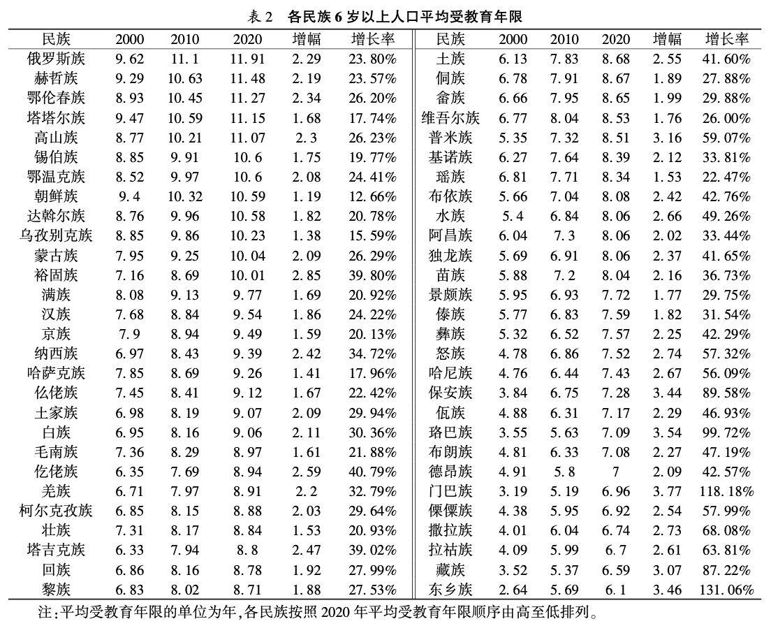 ⑤平均受教育年限增长幅度为各民族2020年平均受教育年限与2000年平均受教育年限的差值,增长率为各民族2020年平均受教育年限增幅与2000年各民族平均受教育年限的比值。