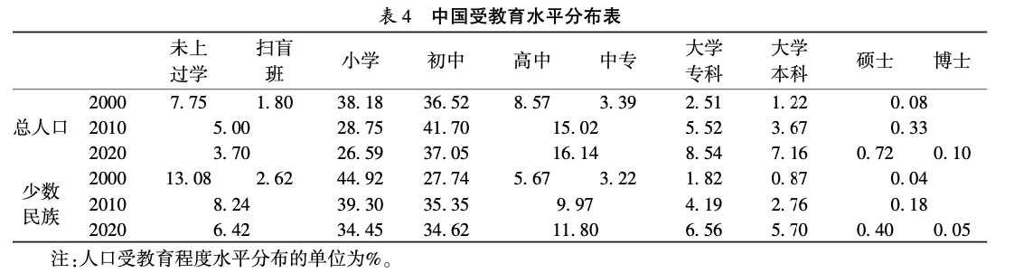 主要体现为以下三点。首先是未上过学的人口占比急剧下降。总人口中未上过学的人口比例由2020年的7.75%下降至2020年的3.70%,少数民族人口未上过学的比例由2000年的13.08%下降至2020年的6.42%。在2000年的第五次人口普查,接受扫盲班教育的人口占比已接近于0,之后的普查中不再加以统计。其次是中等教育的普及。总人口中接受过初中教育的人口占比由2000年的36.52%上升至2020年的37.05%,接受过高中教育的人口占比从8.57%上升至16.14%。少数民族中接受过初中教育的人口占比由27.74%上升至34.62%,接受过高中教育的人口占比从5.67%上升至11.80%。2020年接受过初中教育的人口占比在总人口和少数民族人口中的各级教育级别中都是最大的。最后是高等教育的长足发展。2000年我国总人口和少数民族人口中,接受过高等教育的人口占比都很低,总人口中为3.81%,少数民族人口中为2.73%。至2020年已分别上升为16.52%和12.71%,见表4。这种进步体现了党和国家对各民族人口发展权利提供的充分保障。