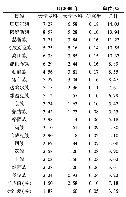 表6的(A)和(B)分别列举了2020年和2000年我国高等教育人口占比最高的20个民族。2000—2020年,这些民族的高等教育均有长足发展,高等教育人口占比的平均值从7.18%上升至25.49%。由表6(A)可知,2020年我国部分民族的高等教育人口占比已达到较高水平,超过30%的民族有俄罗斯族、赫哲族、鄂伦春族、塔塔尔族和高山族。