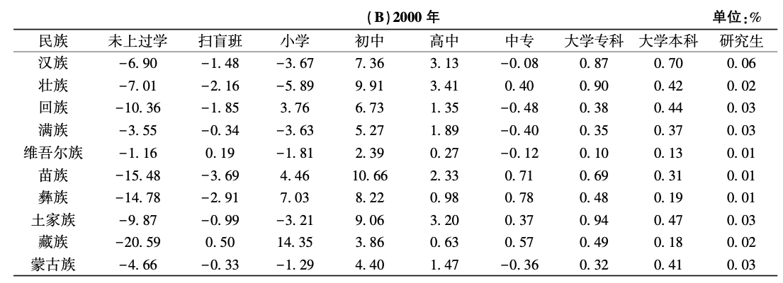 ⑧本文省略了各时间节点上,各民族男性人口和女性人口在各教育级别上人口占比的具体数字,只以男性人口占比减女性人口占比衡量特定级别上的性别差异,女性人口占比高于男性时表现为负值。