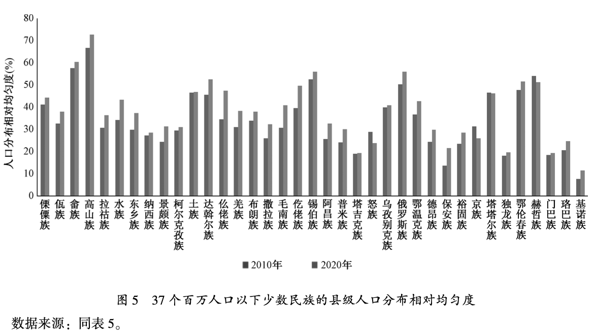 2010—2020年,我国少数民族总体的县级相对人口分布均匀度提高了2.87个百分点。在55个民族中,49个少数民族的相对人口分布均匀度有所提高,其中,仫佬族提高10个百分点以上,京族、怒族、赫哲族、塔塔尔族、回族、哈萨克族6个少数民族县级人口分布相对均匀度有所下降。