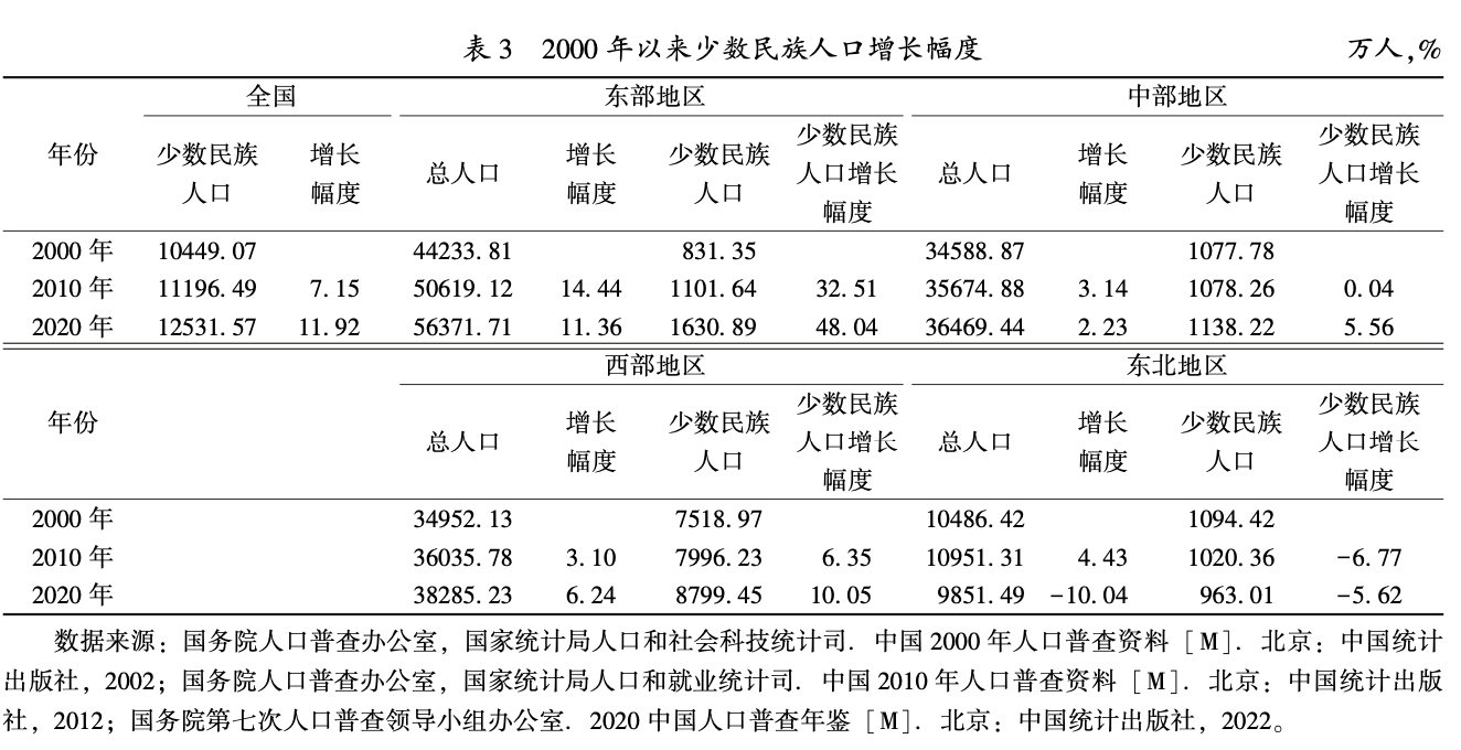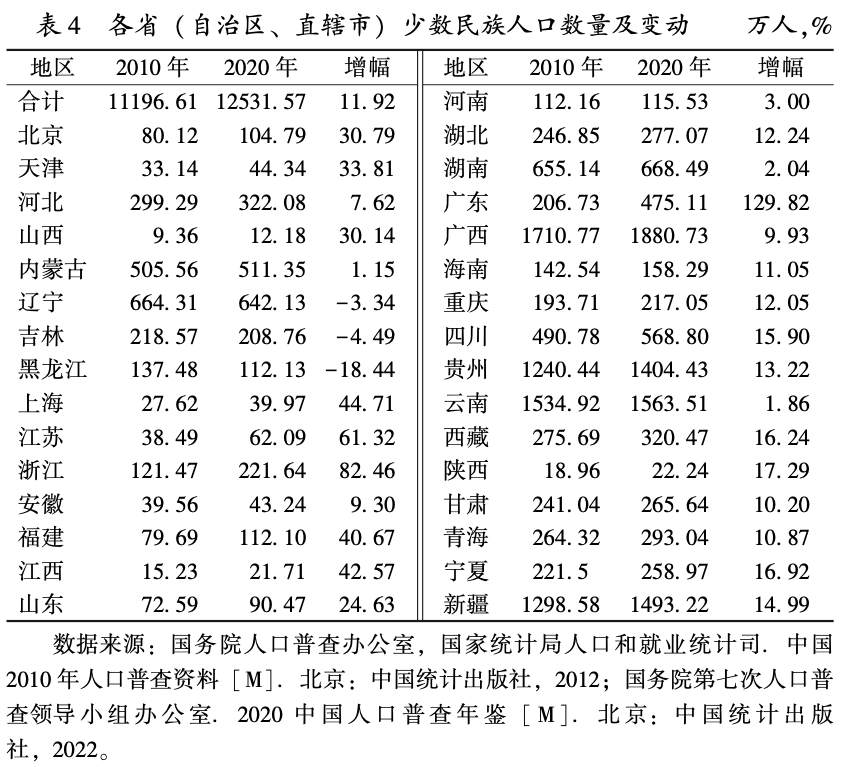 从七普数据看,2010—2020年东部地区少数民族人口增长了48.07%,高于全国少数民族人口的增长幅度(11.92%),也远高于东部地区总人口的增长幅度(11.36%),中部地区和西部地区的少数民族人口增长幅度也分别高于各自地区的总人口增长率,东北地区的总人口和少数民族人口均呈现净流出态势,但少数民族人口下降幅度低于东北地区总人口的下降幅度。