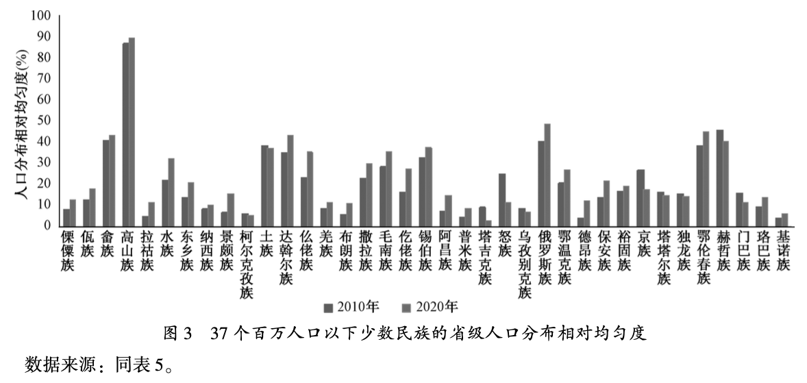 (2)各少数民族人口分布相对均匀度的提高,其成因可以分为“各地区间分布趋向均匀”及“地区间分布趋向均匀和居住地区增多两种因素并存”两种类型。从省级人口分布方面来考察,2010—2020年间我国少数民族省级人口分布相对均匀度提高3.59个百分点,有43个少数民族的省级人口分布相对均匀度提高,12个少数民族的省级人口分布相对均匀度下降。在43个省级人口分布相对均匀度提高的民族中,其中36个民族2010年、2020年在31个省(直辖市、自治区)都有人口分布,它们的省级人口分布相对均匀度的提高,成因是这些少数民族人口在31个省(市、自治区)的“地区间分布趋向均匀”;其他7个少数民族省级人口分布相对均匀度提高的成因包括两方面:一是该民族各地区人口占该民族总人口的比重趋向平均,二是该民族居住地区增多,是“地区间分布趋向均匀和居住地区增多两种因素并存”所造成的。