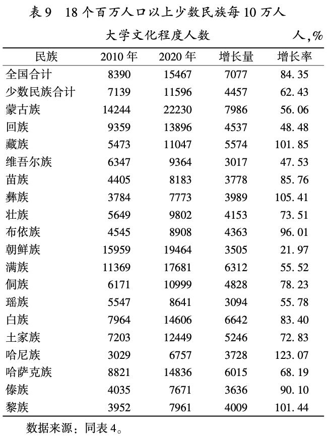 随着全国义务教育的全面普及,2010—2020年我国少数民族教育进步主要体现在高等教育人口比重的增加。来自少数民族聚居区的学生到城市接受高等教育,毕业后到发达地区、城市生活和工作,直接改变了少数民族人口的分布。