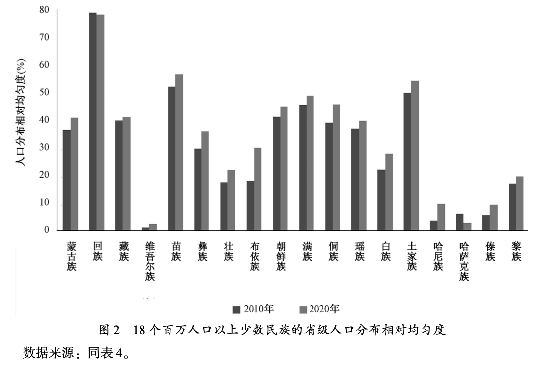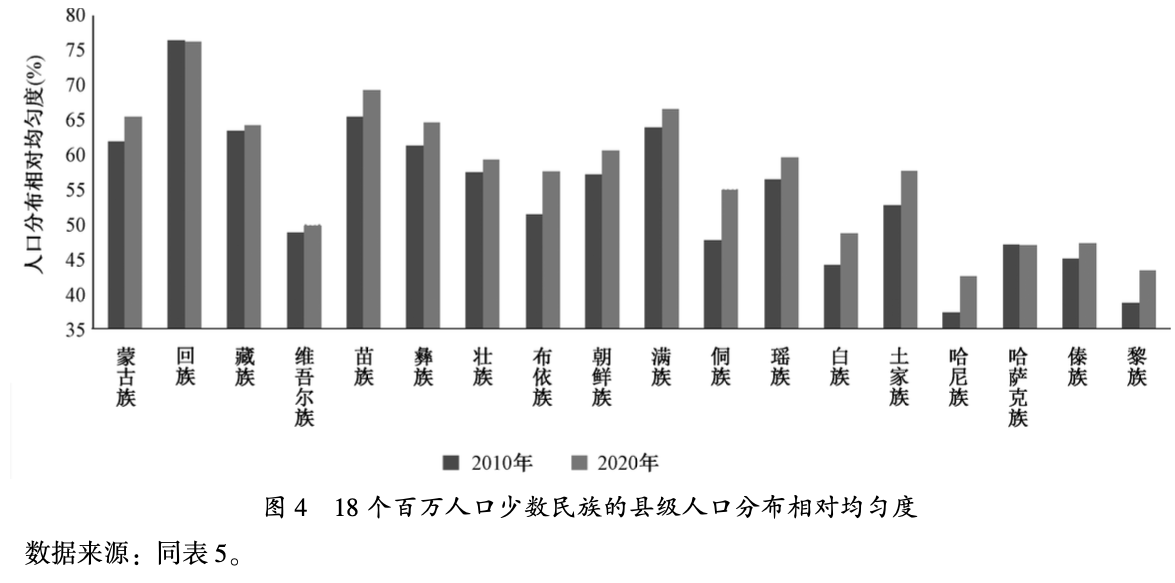 以2020年人口流动为例,全国少数民族省内流动总人口为2295.55万人,跨省流动总人口为1071.75万人,省内流动人口数量是跨省流动人口的2.14倍。在18个百万人口以上少数民族中,苗族、布依族的跨省流动人口数量高于省内流动人口数量,其他16个少数民族的跨省流动人口数量均低于省内流动人口。如2020年98.72%的维吾尔族人口居住在新疆,分布在自治区内全部106个县(县级市)。近年来,新疆大力推进南疆农村剩余劳动力到北疆经济发达城市就业,2020年维吾尔族在自治区内流动人口达到160.44万人,是同期跨省流动人口数量的17.10倍,比2010年增长了120.29%,这些变化使得维吾尔族的县级相对人口分布均匀度远高于省级相对人口分布均匀度。