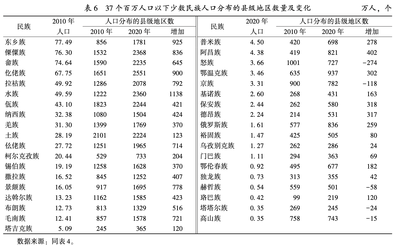 2020年其他37个少数民族的人口数量差异比较显著,其中东乡族等9个民族的人口数量在31.30万至77.49万人之间,另外28个民族人口低于30万,规模在0.35万人至28.19万人。一个民族有人口分布的县级地区数量与一个民族人口总量有关,也与其人口分布均匀程度有关。37个少数民族的人口数量、有人口分布的县级地区数变动见表6。