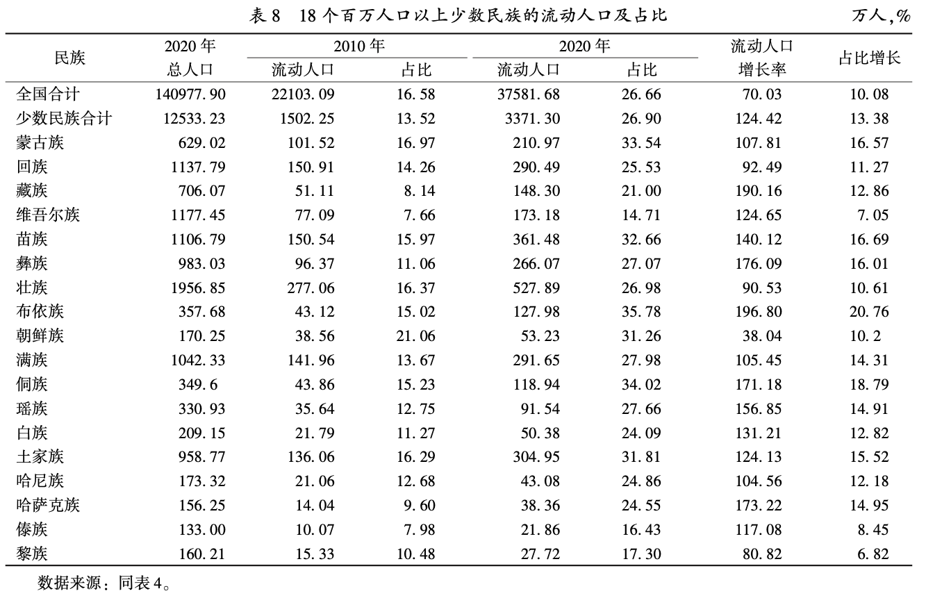 2020年全国流动人口达到37581.68万人,流动人口占比提高到26.66%,即全国每四人中有一人在流动。2020年我国少数民族流动人口达到3371.30万人,占全国流动人口总量的8.97%,高于少数民族总人口占全国总人口的比重(8.89%)。2020年我国少数民族流动人口占少数民族总人口比重为26.90%,首次超过全国平均水平(26.66%)。