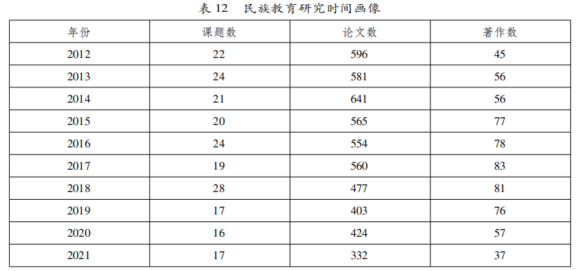 接下来我们从时间、空间、内容等视角对研究投入、研究产出、研究影响力三个维度进行综合分析,以形成民族教育研究的综合画像。
