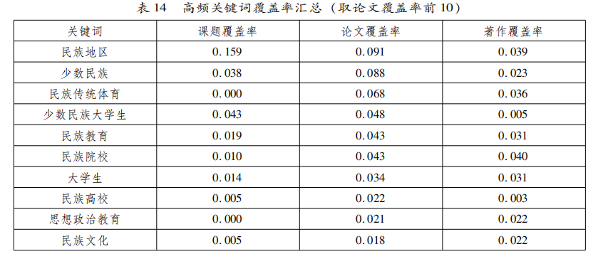 从表15可知,论文中使用的关键词覆盖率与著作中使用的关键词覆盖率相关系数较高且达到了显著,其次是课题与论文之间的相关系数,最次是课题与著作之间的相关系数,三者之间的相关性均达到了显著。这表明,民族教育研究话语体系在不同场合均有较高的一致性,这也表明,民族教育研究对象多集中在高等教育这一纵向研究内容以及铸牢中华民族共同体意识研究、民族团结进步教育研究、民族文化与教育研究、民族思想政治教育、民族教育与心理研究、民族地区语言教育研究等横向研究内容。这与《国务院关于加快发展民族教育的决定》所提出的“打牢各族师生中华民族共同体思想基础”的要求是一致的。我们知道,信息技术对教育发展具有革命性影响,教育信息化可带动、推动乃至支撑引领教育现代化,教育信息化对于广袤的民族地区教育尤其重要,然而在表14中的高频清单中未见任何与教育技术相关的术语,这是当前民族教育研究的一项重大缺失。
