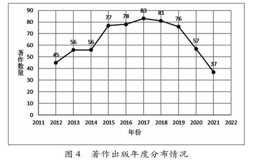 经剔除非民族教育类研究著作,并进一步剔除著作类型包含“编著”“译”“主编”等的著作,得到646部专著,出版年度分布如图4所示。