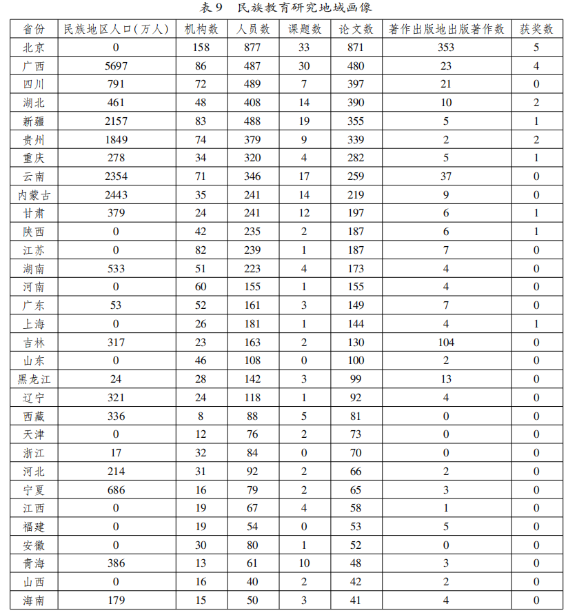 这里以省份为分类项,并以各省拥有的民族人口③作为参照,汇总研究投入(课题数、机构数、人员数)、研究产出(论文数、著作数)以及成果影响(成果奖数),得到如表9所示结果(以论文数逆序排列)。中国大陆地区31个省、自治区、直辖市均在其中。