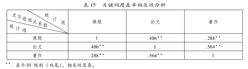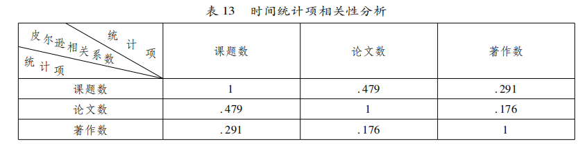 由表12及前文的时间分布图可知,课题数、论文数、著作数均呈现出先上升后下降的变化。使用SPSS23.0分析上述各统计变量之间的相关性,采用皮尔逊相关系数,显著性检验为双尾,得到如表13所示结果。