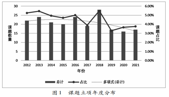 由图1可知,民族教育研究的课题立项总量总体上呈下降趋势,其在全部课题中的占比总体上也呈下降趋势。