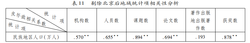 如表11所示,相关系数明显提高,除著作出版地外,民族地区人口与各统计项均有较高且显著的相关性,特别是民族地区人口与课题数、获奖数的相关系数接近0.9。这表明面向民族地区人口的民族教育是开展民族教育研究的基础,依托这一基础不断投入,必定会带来相应产出,并最终反哺民族教育。