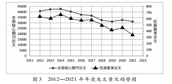 查询中国知网引文数据库,学科类别限定在“社会科学II辑”中的从“教育理论与教育管理”至“体育”等教育学相关分类,被引文献类型限定为“期刊类型”,被引题名包含“族”或“民族”,被引期刊类别限定在“CSSCI收录刊”“核心期刊”,出版年自2012年至2021年,查询时间为2022年4月10日,得到被引文献4780篇,总被引35898次,篇均被引6.99次(以5133篇论文为分母)。选取教育学顶级期刊《教育研究》作为对比对象,《教育研究》2012年至2021年刊载论文2647篇,被引79949次,篇均被引30.20次。相比之下,差距还是较大的。