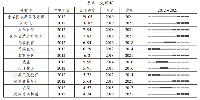 从突现词来看,民族教育的热点随时代和政策背景的变化而变迁。例如近年来,“国家认同”“文化认同”“精准扶贫”“中华民族共同体意识”等新兴的研究热点与国家有关政策密切相关。