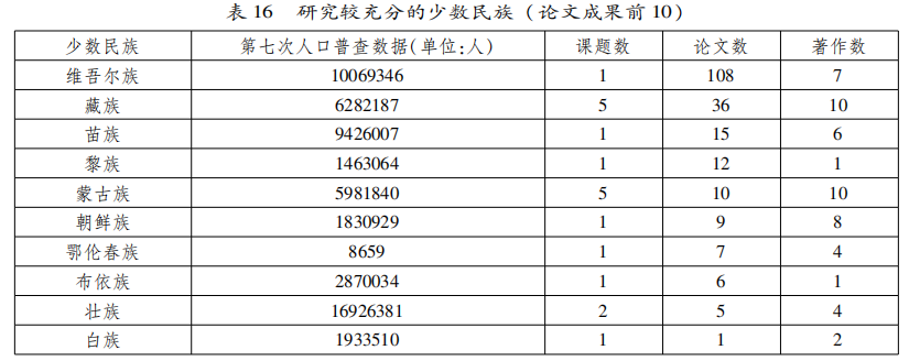 接着我们再来整合各民族主题研究的课题和论文、著作情况,同时配上第七次全国人口普查中各民族的人口数据,得到如表16所示结果。这里依然以论文数逆序排列,取前10呈现。这10个民族恰恰也是课题、论文、著作均有的,可以视为研究较充分的民族。
