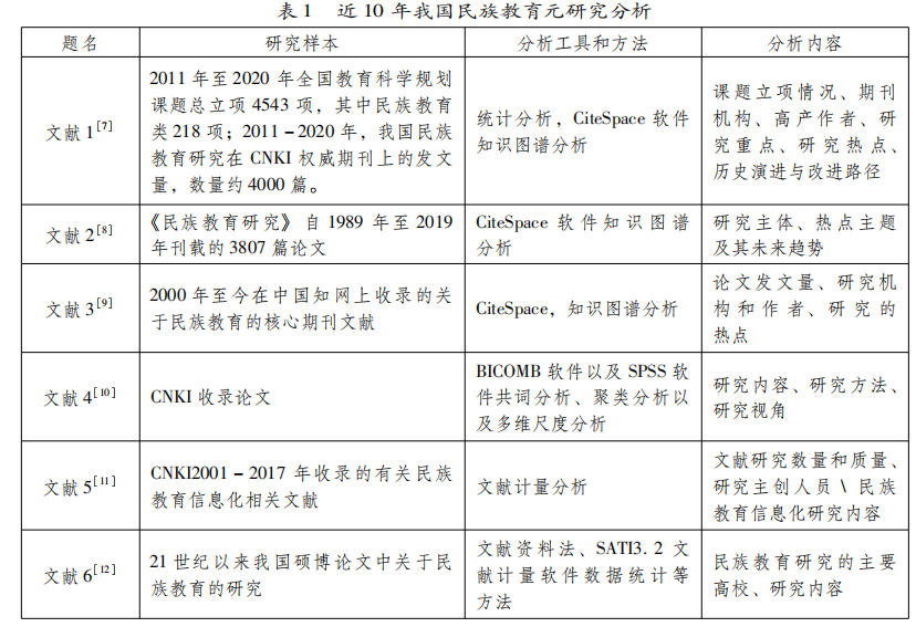一些学者已经做了很好的元研究,元分析数据不断扩展,分析不断深入,但问题持续存在。安雪慧的《民族教育研究学刊所载论文的文献计量研究》选取了《民族教育研究》期刊1990年~1995年的403篇学术论文作为研究样本分析了论文内容、研究方法和引文量、类型、语种等分布情况,探讨了民族教育中存在的一些问题和解决思路。该文发表距今已二十余年。[4]滕星和彭亚华的《20世纪80年代后的中国民族教育研究发展综述》从民族教育的理论研究和研究方法两个角度概述了中国民族教育研究的发展趋势。[5]常永才和哈经雄的《“十五”期间民族教育研究评述——以全国教育科学规划立项课题为例》从全国教育科学规划立项课题的角度对我国民族教育研究状况进行了分析。[6]近10年也有这方面的成果发表,具体如表1所示。