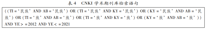 通过CNKI学术期刊库搜索2012年至2021年发表的民族教育相关论文,文献分类限定在“社会科学II辑”中的从“教育理论与教育管理”至“体育”等教育学相关分类,期刊来源限定在“CSSCI来源期刊”“北大核心期刊”,检索语句和界面如表4所示,检索时间为2022年4月11日。