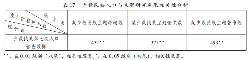 使用SPSS23.0分析民族人口与成果数量之间的相关性,采用皮尔逊相关系数,显著性检验为双尾,得到如表17所示结果。